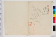 {小野職愨氏ノ書状ニ、朱書}此腊葉ハ「クロキ」ト愚考仕候ヘ共、御一覧ノ上名称御取調被下度、産地ハ近江石山寺辺ニ多ク有之候、云々/{篤按ニ、小野氏ノ「クロキ」ト考シハ非ナラン、矢張尋常ノハイノキナルベシ、十六年五月田中氏ヨリ来ル腊葉ト蓋シ同物、朱書}/花梗/{小野氏ヨリ来リシ腊葉、朱書}/ハイノキ/山礬、クロハイ〈土佐〉/山礬凝雪、一名七里香、王荊公欲賊詩、以不知出処而止、山谷取梅与水仙、伯仲三不後宮梅、試暁妝、凌波能亜、水仙行高蹤未許、荊公識名品虚労、山谷揚己見充分、矜雪色詎惟七里、賦天香君看破臘、璃階裏廻出先春、一種芳【花暦百詠 下】/{百十三、斉墩科、朱書}