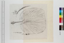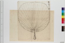 イロ、鼈甲、蒲葵扇、表面ニ花ノ粗画アリ、支那舶来トミユ