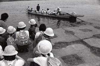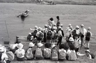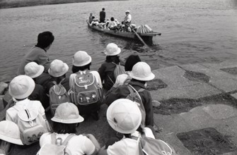 / 子供,船,鞄,堤防,帽子,リュックサック,川,体操服,靴,先生,人,救命胴衣