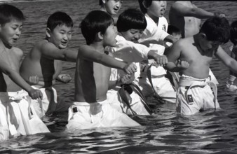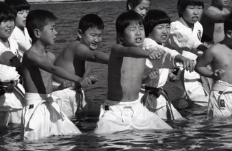 / 子供,上裸,道着,掛け声,拳,武道,空手,川,寒稽古