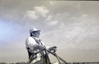 船頭手漕ぎで / 船,鵜飼,河畔植生,眼鏡,法被,人,長良川,手袋,救命胴衣,車,タオル,笑顔,帽子