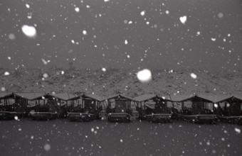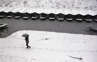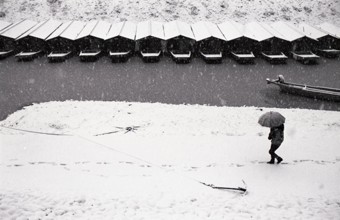 雪の船だまり / 船,屋形船,雪,水,植物,河畔植生,人,傘,川
