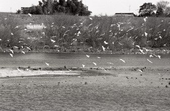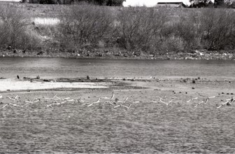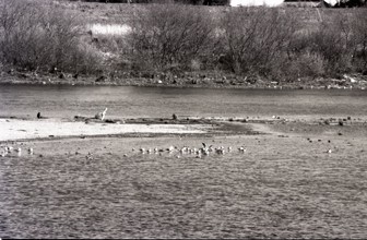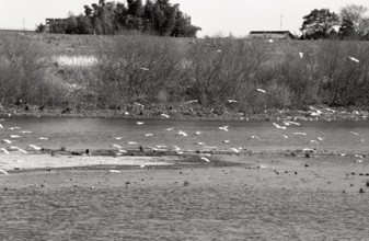 / 鳥,水,中洲,植物,河畔植生,木,土手,堤防,建物,電柱,笹,竹,川