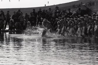清流で禊ぎ / 寒中水泳,子供,裸,褌,はちまき,カメラマン,人,堤防,水しぶき,法被,祭り,法被,ふんどし,標識,帽子