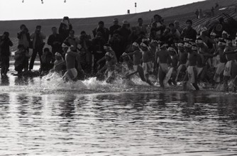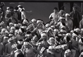 / 寒中水泳,子供,裸,褌,はちまき,カメラマン,人,堤防,水しぶき,法被,祭り,法被,ふんどし,標識,帽子