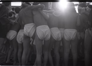 / 裸,褌,はちまき,人,胴上げ,建物,植物,祭り