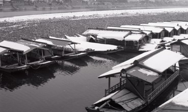 / 船,屋形船,船着き場,雪,水,河原,山,木,植物,河畔植生,道路,電柱,鉄塔,バス,川
