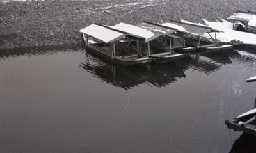 舟止め場 / 船,屋形船,船着き場,雪,水,河原,山,木,植物,河畔植生,道路,電柱,鉄塔,バス,川