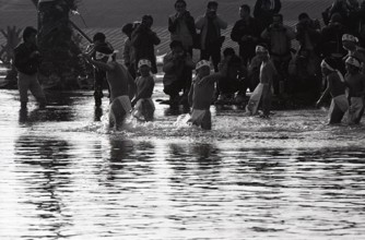 / 寒中水泳,子供,裸,褌,はちまき,カメラマン,人,堤防,水しぶき,法被,祭り,ふんどし,標識,帽子