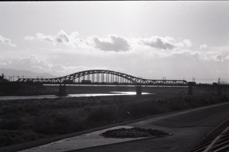 / 植物,木,河畔植生,土手,堤防,川,河原,水,橋,鉄橋,電柱,鉄塔,電線,信号機,車,雲,空,太陽