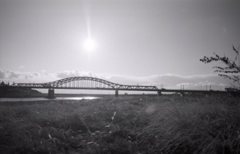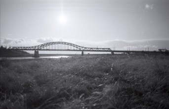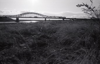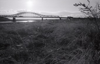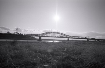 / 植物,河畔植生,土手,堤防,川,河原,水,橋,鉄橋,電柱,鉄塔,電線,信号機,車,雲,空,太陽