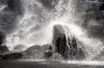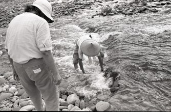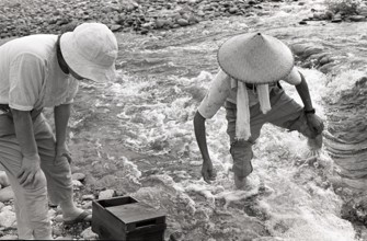/ 人,服,帽子,笠,時計,木箱,タオル,靴,川,岩石,しぶき