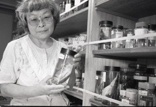 魚博士・後藤宮子氏 / 人,服,眼鏡,瓶,魚,液浸標本