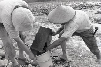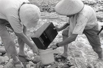 / 人,服,帽子,笠,時計,木箱,タオル,靴,バケツ,岩石,しぶき,川