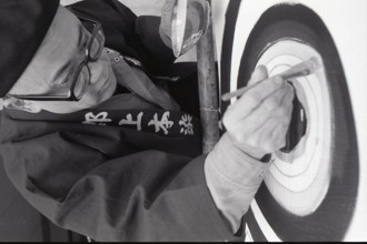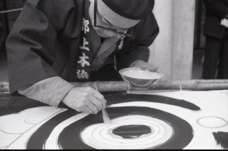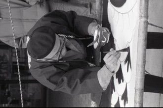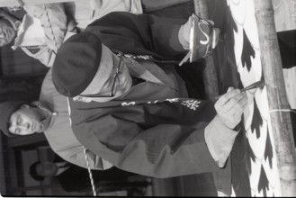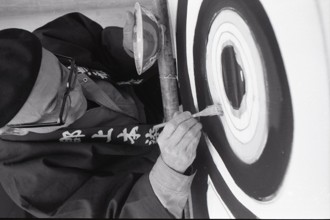 郡上染師・渡辺庄吉氏 / 人,筆,帽子,眼鏡,法被,お椀