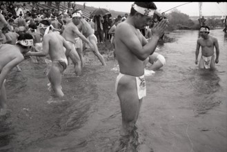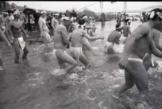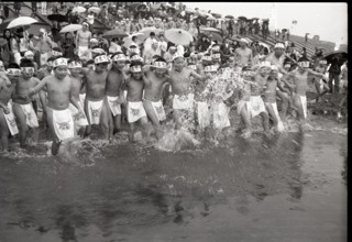 裸祭り / 子供,裸,傘,人,しぶき,はちまき,眼鏡,川,堤防,カメラ,和服,ふんどし