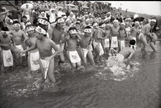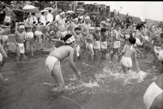 / 子供,裸,傘,人,しぶき,はちまき,和服,カメラ,堤防,帽子,眼鏡,ふんどし,川