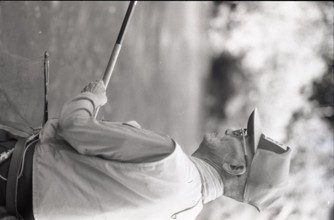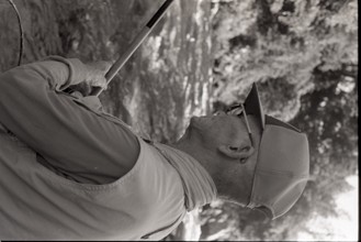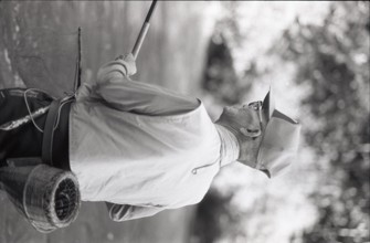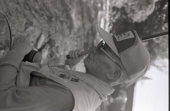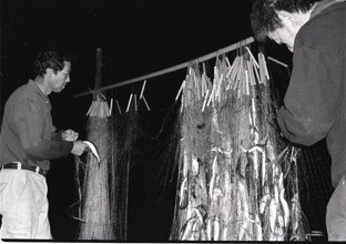 釣り名人・恩田氏 / 人,釣り竿,服,帽子,網,眼鏡,かご,川