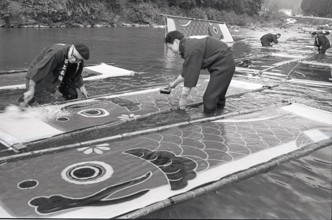 鯉のぼり寒ざらし / 人,鯉のぼり,法被,川,眼鏡,帽子,河畔植生,岩石,建物,街灯,電柱,橋,竹