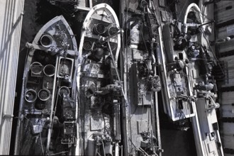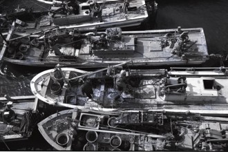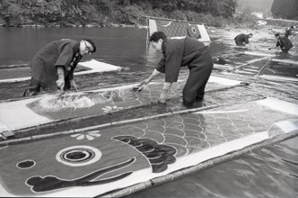河口堰閘門 / 舟,人,籠,ロープ,漁船,帽子,網,貝
