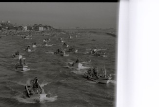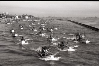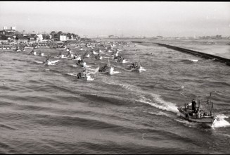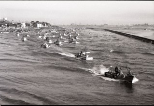暁の出航 / 船,漁船,白波,橋,家,建物,人