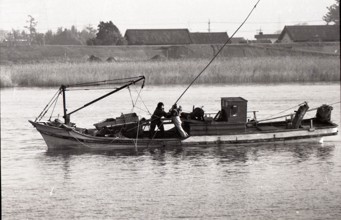 力を合わせて / 漁船,人,河畔植生,家,堤防,川,建物,電線,電柱