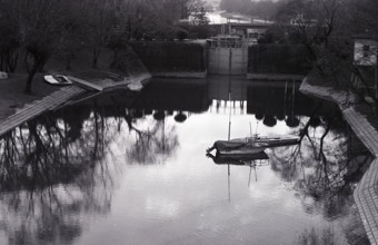 / 船,川,水,植物,河畔植生,木,土手,堤防,水門,建物,人
