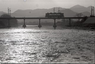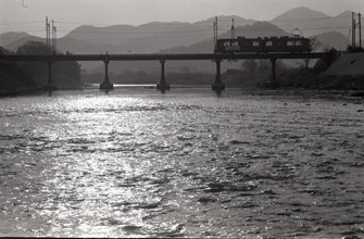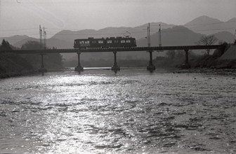 郊外電車が行く / 川,電車,橋,山,河畔植生,電線,岩石