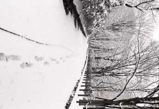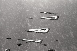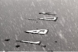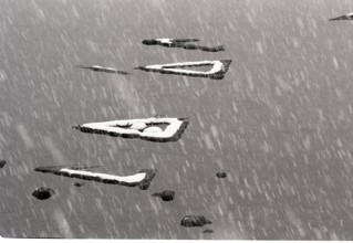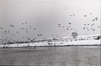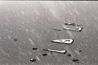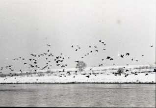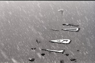 雪に飛ぶ / 鳥,岩石,消波ブロック,水,雪,川