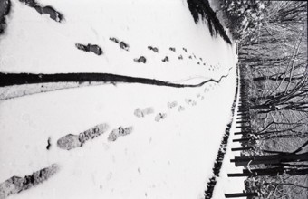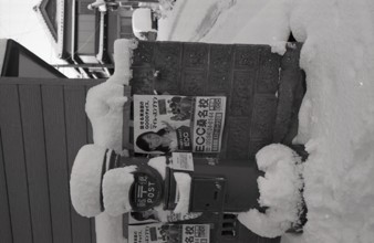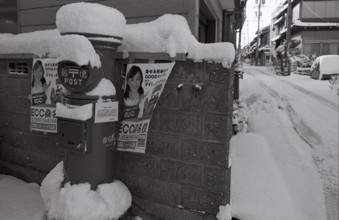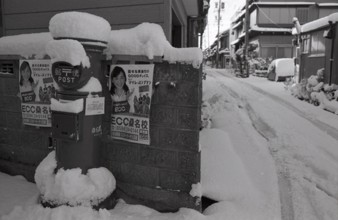 / 雪,ポスト,ポスター,建物,電柱,植物,車,窓