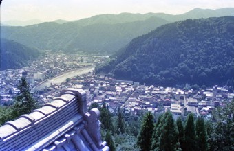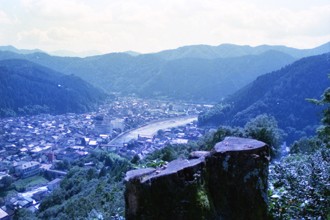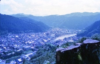 八幡町全景 / 山,町,建物,植物,岩石,川,橋,木,空