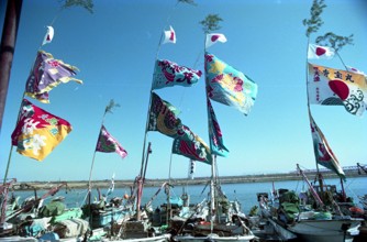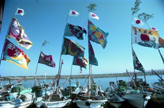/ 船,漁,漁業,旗,大漁旗,国旗,竹竿,水,漁船,タイヤ,橋,建物,川,空,カゴ,ロープ