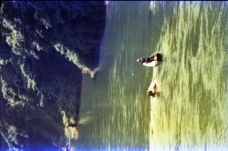 / 人,船,釣り竿,岩石,崖,帽子,川,河畔植生,木