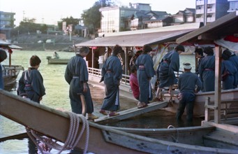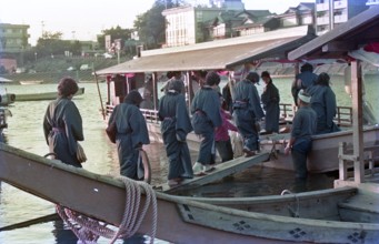 遊覧船乗船 / 人,船,着物,建物,植物,はちまき,木,和服,川