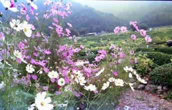/ 花,コスモス,山,植物,建物,岩石