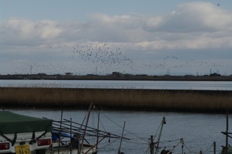/ 船,植物,河畔植生,鳥,空,人,帽子,建物,鉄塔,木,川