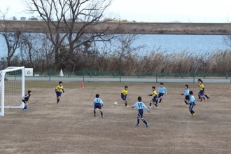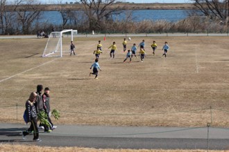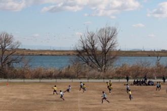 / 人,子供,三角コーン,植物,木,川,堤防,ボール,ゴール,鉄塔,鳥
