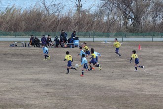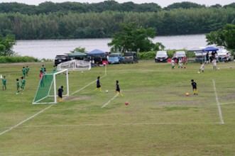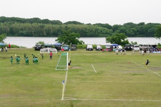 / 人,ボール,サッカー,川,植物,木,河畔植生,ゴール,三角コーン,子供,椅子,帽子,カメラ,鳥
