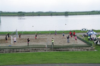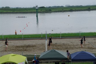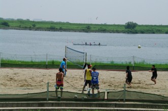 / 人,川,植物,河畔植生,木,空,ボール,バレー,建物,鉄塔,車,帽子,眼鏡,サングラス,ネット,船