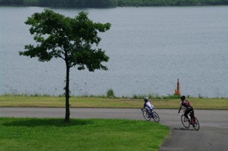 / 人,自転車,ヘルメット,木,植物,川,河畔植生,花,子供