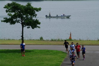 / 人,帽子,船,川,テニス,木,植物,河畔植生,子供,車,堤防