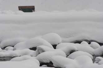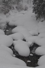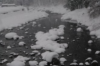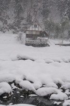 / 雪,冬,河畔植生,植物,建物,小屋,川,岩石,木,森林,竹藪
