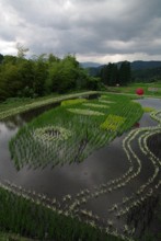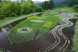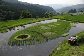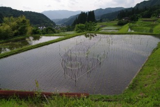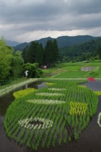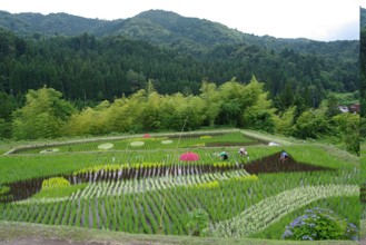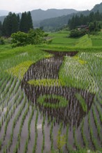 / 農業,田んぼアート,稲作,魚,山,植物,棚田,竹藪,建物,傘,竿,岩石,人,木,森林