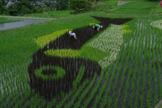 / 農業,田んぼアート,稲作,魚,山,植物,棚田,人,帽子,農家,農作業,鳥居,神社,電柱,岩石,木