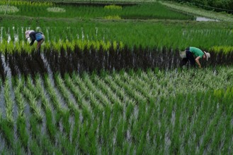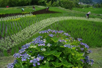 / 農業,田んぼアート,稲作,魚,山,植物,棚田,竹藪,建物,傘,竿,農家,農作業,帽子,人,アジサイ,花,木,森林