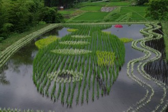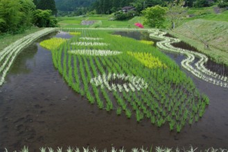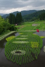 / 農業,田んぼアート,稲作,魚,山,植物,棚田,建物,人,帽子,農家,農作業,岩石,木