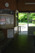 / 線路,電車,長良川鉄道,植物,駅,岩石,道路,建物,山,看板,駅舎,時計,時刻表,椅子,木