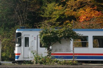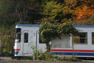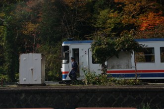 / 線路,電車,長良川鉄道,植物,駅,岩石,道路,建物,山,電柱,紅葉,人,車掌さん,帽子,木,森林