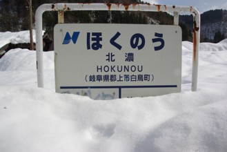 / 線路,電車,長良川鉄道,植物,駅,岩石,山,雪,冬,看板,建物,駅舎,木,森林