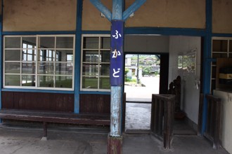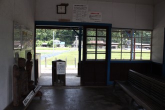/ 線路,電車,長良川鉄道,植物,駅,岩石,山,電柱,電線,駅舎,建物,田んぼ,農業,稲作,ベンチ,椅子,木彫り像,木